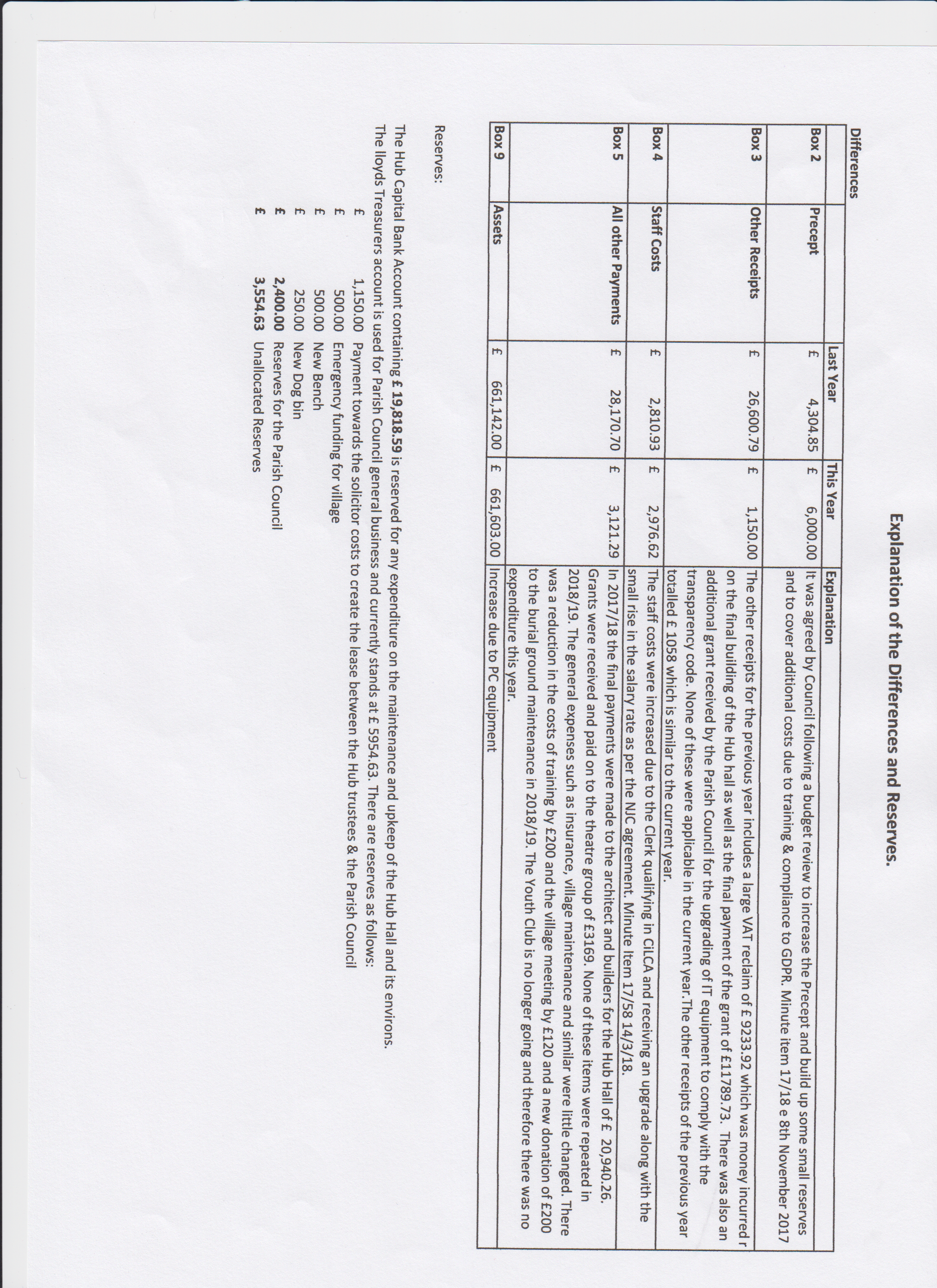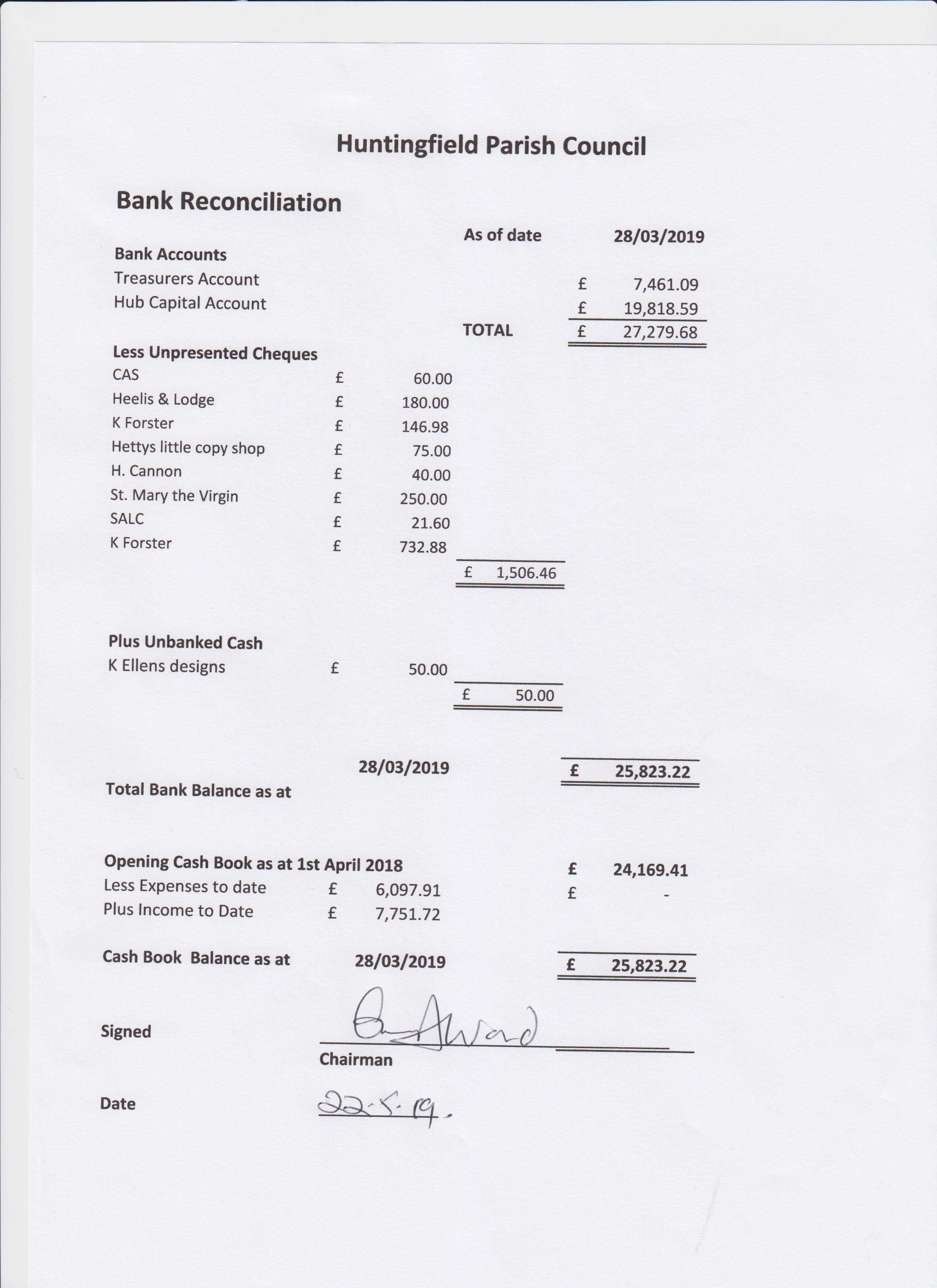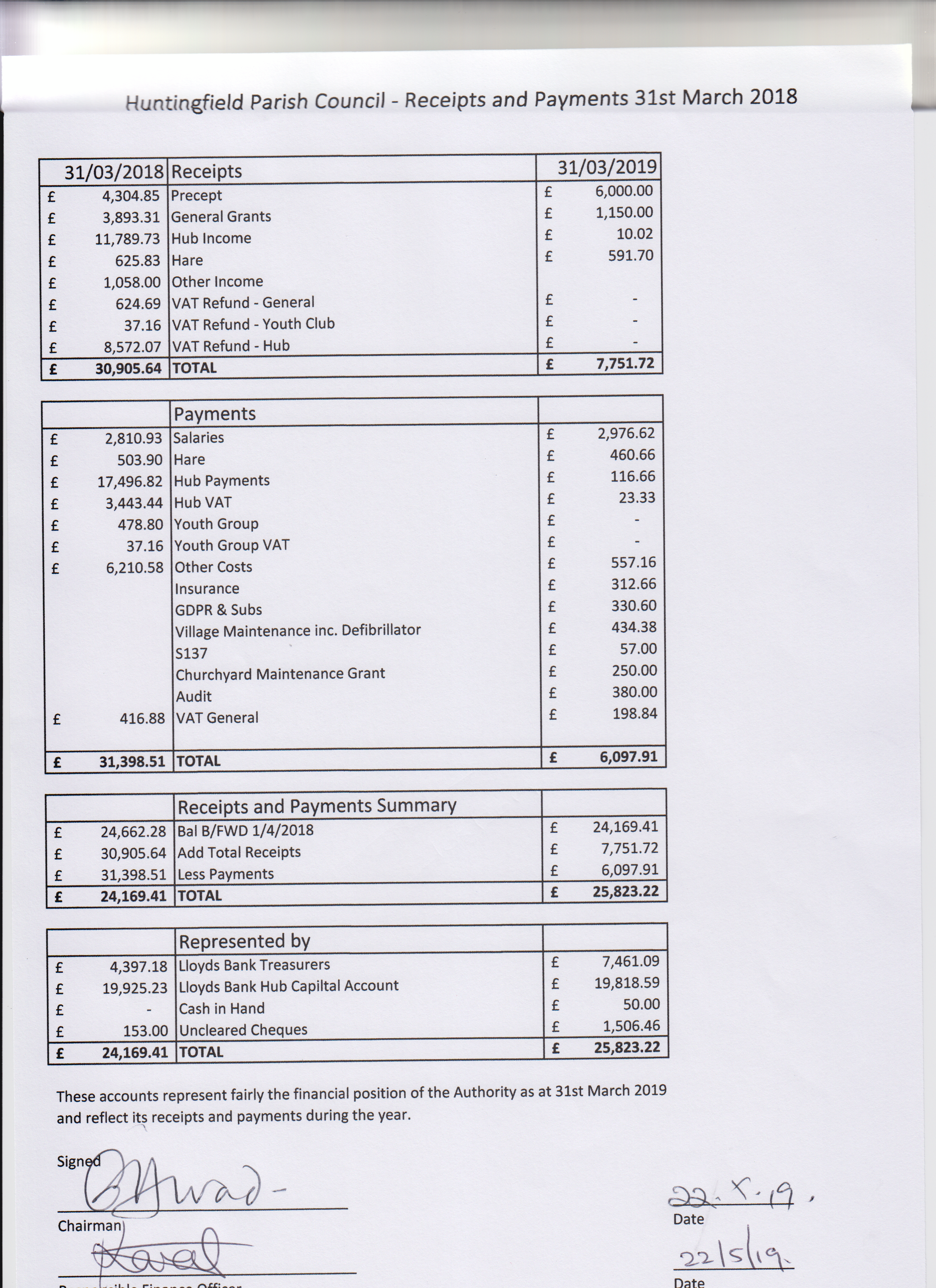 Huntingfield Parish Council reviews the accounts at each regular meeting. There are two documents